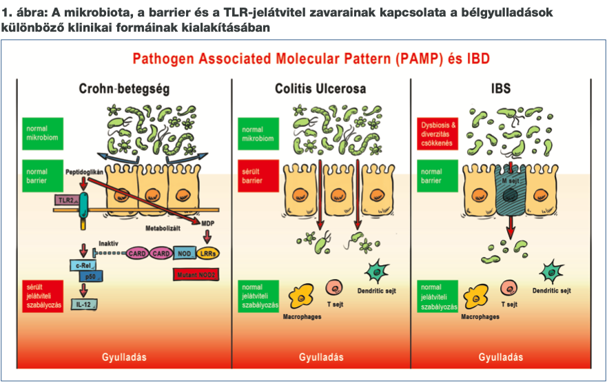A bélbarrier-károsodás átmeneti formái jól ismertek fertőző betegségek esetén is, amikor a víz- és ionvesztés különböző ismert mechanizmusai vezetnek a barrier összeomlásához és sokktünetekhez (11). Akut, ismert etiológiájú betegség esetén ezek elhárítása viszonylag egyszerű oki gyógymódot, illetve kiegészítő szupportív kezelést igényelt, mivel az akut noxa megszűnése után a bél-barrier spontán regenerálódott, és így a barrierműködés mélyebb szabályozása és ennek zavarai kisebb figyelmet kaptak. A bélbarrier-károsodás tekintetében a gyulladásos bélbetegségek (Inflammatory Bowel Disease, IBD) egy különlegesen izgalmas csoportot képviselnek (12). Heterogén etiopatogenezissel jellemezhető betegségcsoportról beszélünk, de az intesztinális permeabilitás növekedése ennek gyakorlatilag minden formájában megfigyelhető. Bizonyos esetekben ez örökletes hajlamhoz is köthető (ilyen pl. a családokban halmozódó colitis ulcerosa, illetve coeliakia) (13), illetve valószínűleg a Crohn-betegség egyes (ma még nem így, a genetikai ok-okozat alapján klasszifikált) formái jelentik a betegségspektrum másik végét, amit NOD2-mutáció jellemez (14). Utóbbi esetben a veleszületett immunitás olyan funkciózavara áll az autoimmun folyamat hátterében, ami a normál intesztinális permeabilitás mellett is képes fokozott gyulladásos választ generálni a bakteriális endotoxinok barrieren átjutó formáinak hatására. Ennek oka ebben az esetben ugyanis a fiziológiás negatív feed-back szabályozás defektusa, amit az antigénprezentáló sejtek „Toll-like” receptorain (TLR) keresztül induló gyulladásos válasz intracelluláris kontrolljának hibája okoz. A kontrollálatlan immunválasz jellegzetesen magával vonja az intesztinális permeabilitás másodlagos növekedését. A gyulladást ezután már fenntartja a gyulladás nyomán sérült barrier miatt kialakuló endotoxaemia, ami a bélfal teljes szélességét érinti, és amit elsősorban a folyamatosan aktiválódó TLR-jelátvitel nyomán felszabaduló TNF-alfa közvetít. Nem meglepő módon a TNF-gátló kezelésre a Crohn-betegség súlyosabb klinikai formáiban a NOD-2 mutáns betegek (jellegzetesen a terminális ileumot érintő, fisztulázó esetek) jól reagálnak és ennek a kezelésformának a klinikai bevezetését elsősorban ez az indikáció uralta (15).