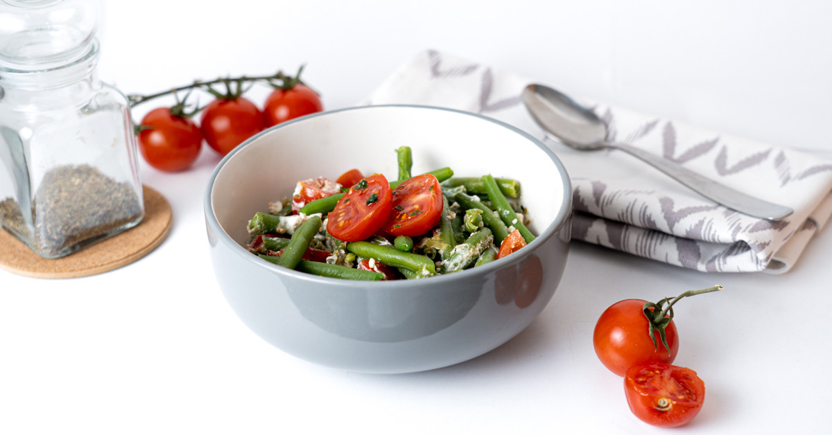 A zöldbabot puhára főzzük sós vízben, amennyiben fagyasztott terméket használunk, akkor a csomagoláson szereplő információk alapján készítsük el. A koktélparadicsomot és a fetasajtot is apró darabokra vágjuk. A zöldbabot, a paradicsomot, és a szétmorzsolt fetasajtot beleöntjük egy tálba. Ízlés szerint fűszerezhetjük, majd egy evőkanál olíva olajjal és egy evőkanál tejföllel alaposan összekeverjük. Mielőtt megsóznánk kóstoljuk meg, mert a fetasajt nagyon sós, így összeségében már nem biztos, hogy szükség lesz só hozzáadására.